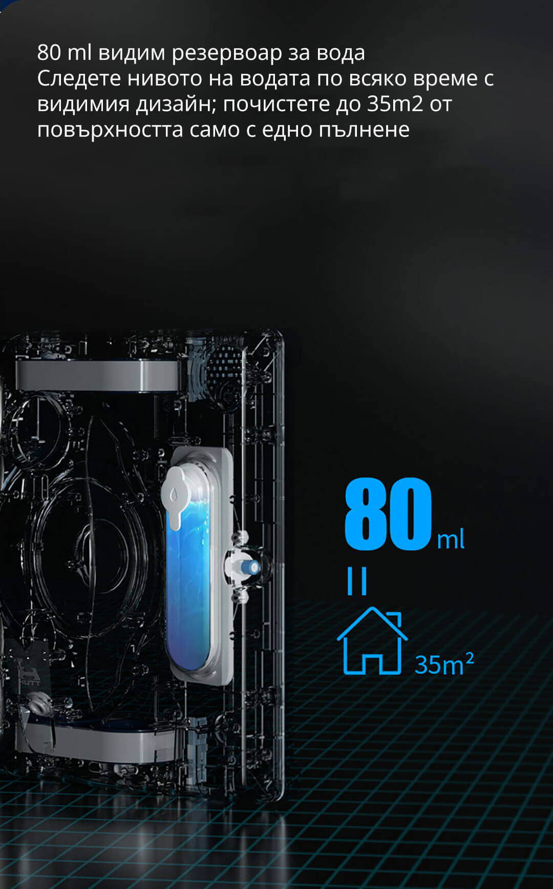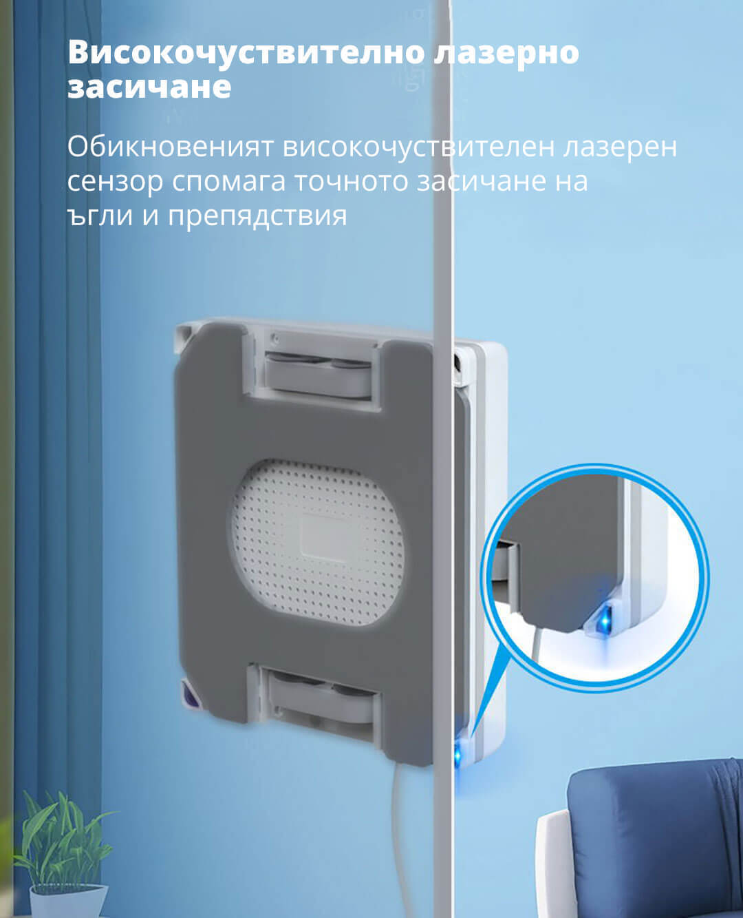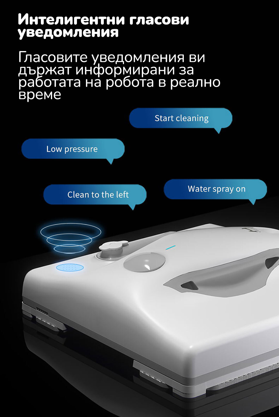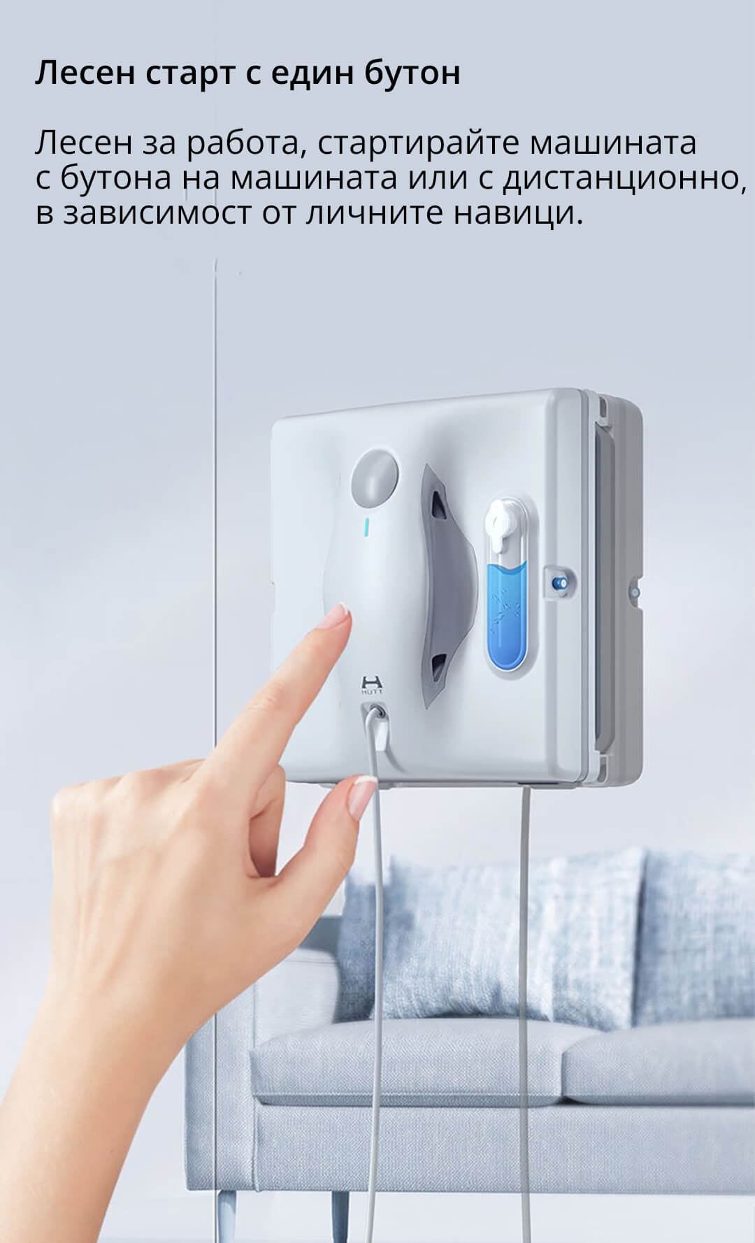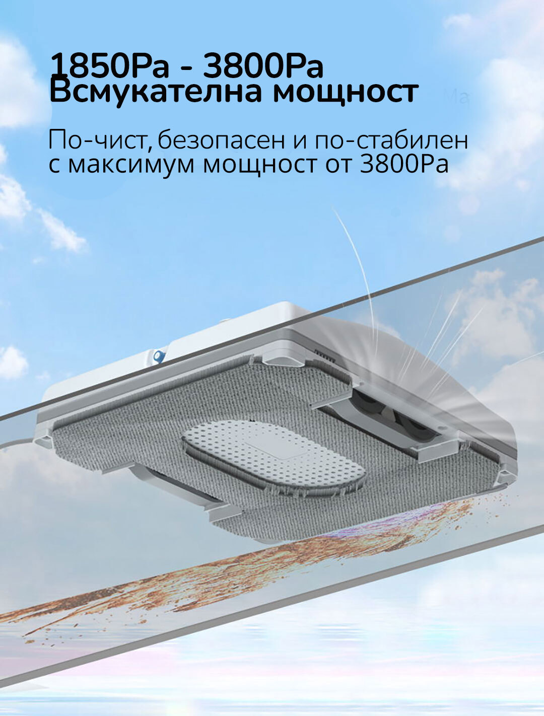 Сухо и мокро почистване Интелигентно планиране на пътя на почистване Почиства до 35 м2 с е едно пълнене на резервоара NIDEC безчетков мотор със скорост 27000 оборота в минута Роботът остава прикрепен към стъклото до 20 минути при прекъсване на захранването Лесен старт с един бутон Al алгоритъм за определяне на степента на замърсяване и необходимата мощност на засмукване от 1850 до 3800 Pa Високочувствителна лазерна сензорна система, която може да открие края на прозореца или наличието на фуги Почиства гладки повърхности като стъкло, дърво и дори стени с плочки Район на приложение : >= 40 см * 60 см |