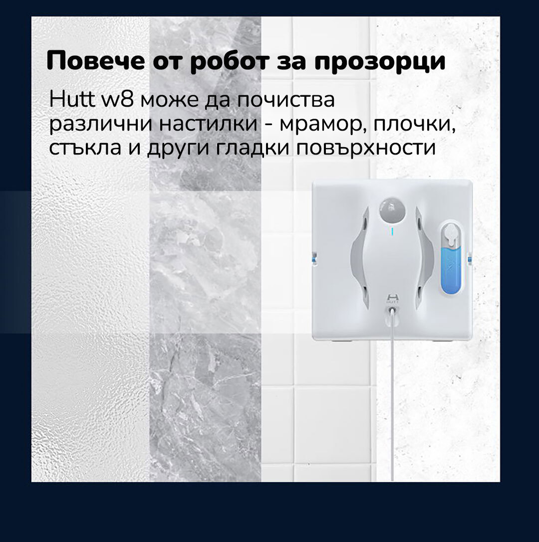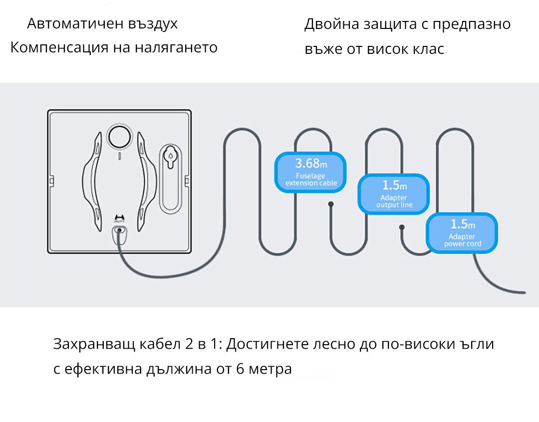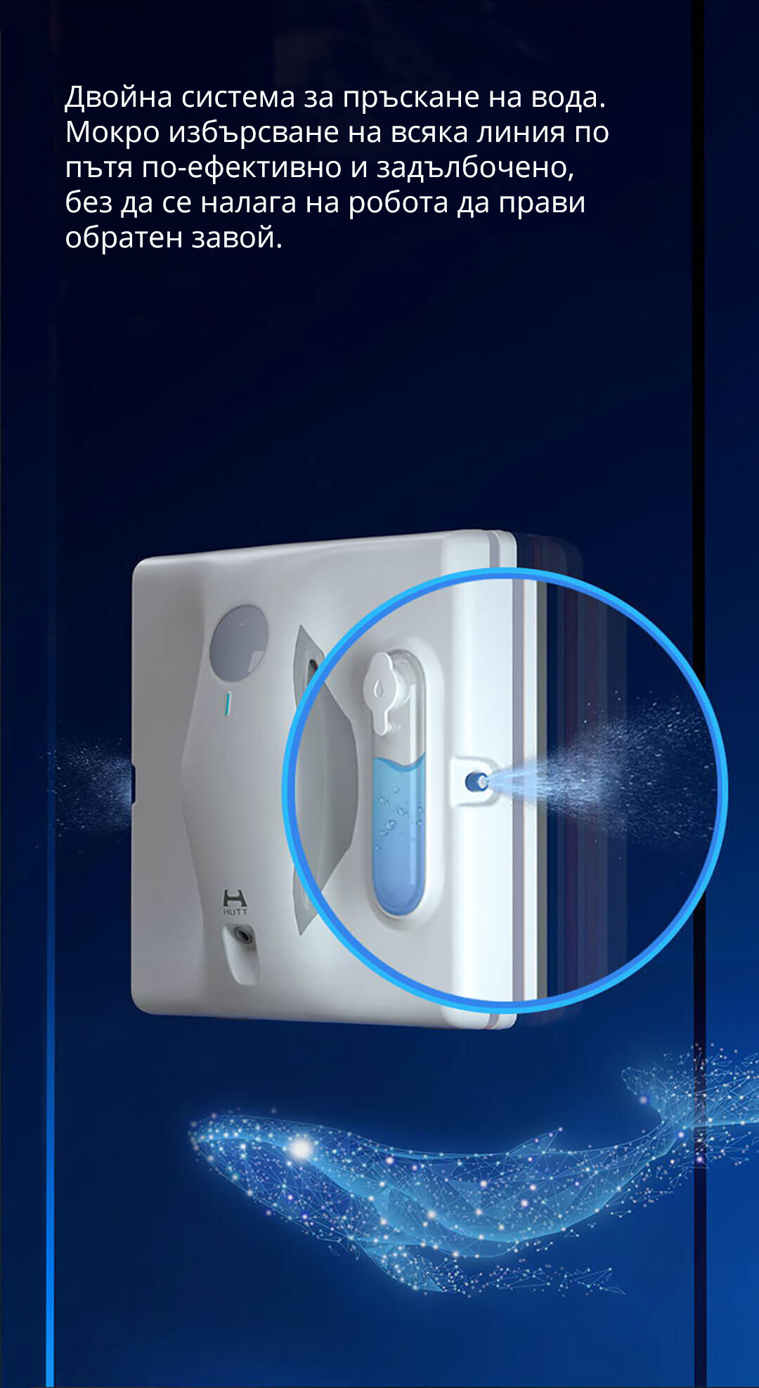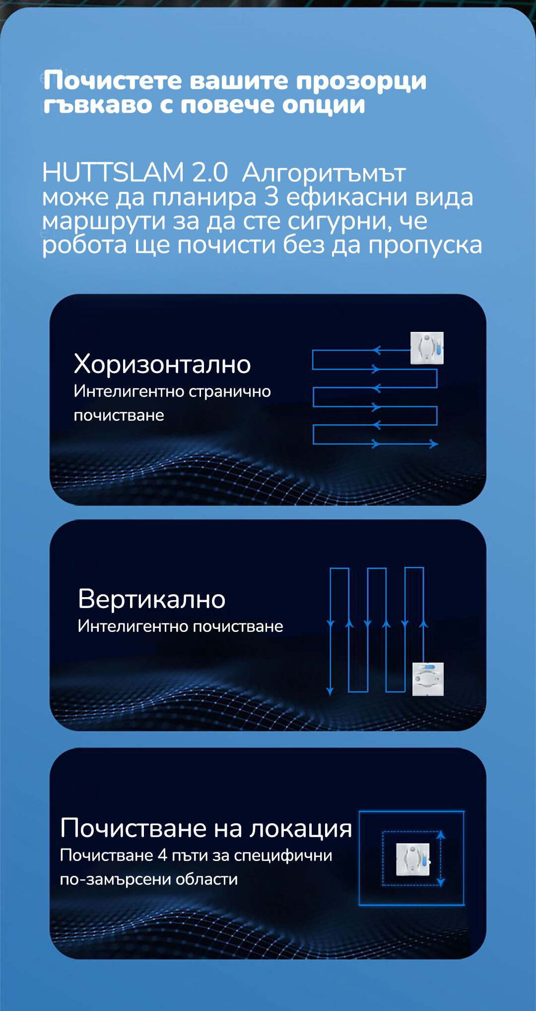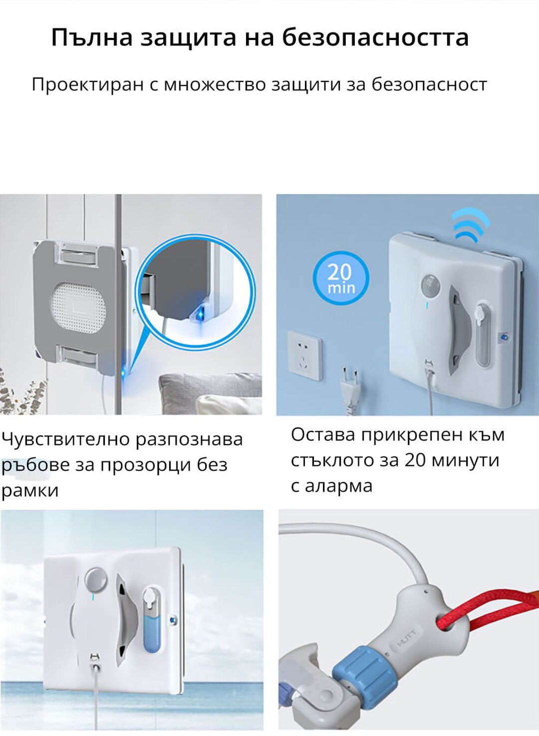 Сухо и мокро почистване Интелигентно планиране на пътя на почистване Почиства до 35 м2 с е едно пълнене на резервоара NIDEC безчетков мотор със скорост 27000 оборота в минута Роботът остава прикрепен към стъклото до 20 минути при прекъсване на захранването Лесен старт с един бутон Al алгоритъм за определяне на степента на замърсяване и необходимата мощност на засмукване от 1850 до 3800 Pa Високочувствителна лазерна сензорна система, която може да открие края на прозореца или наличието на фуги Почиства гладки повърхности като стъкло, дърво и дори стени с плочки Район на приложение : >= 40 см * 60 см |