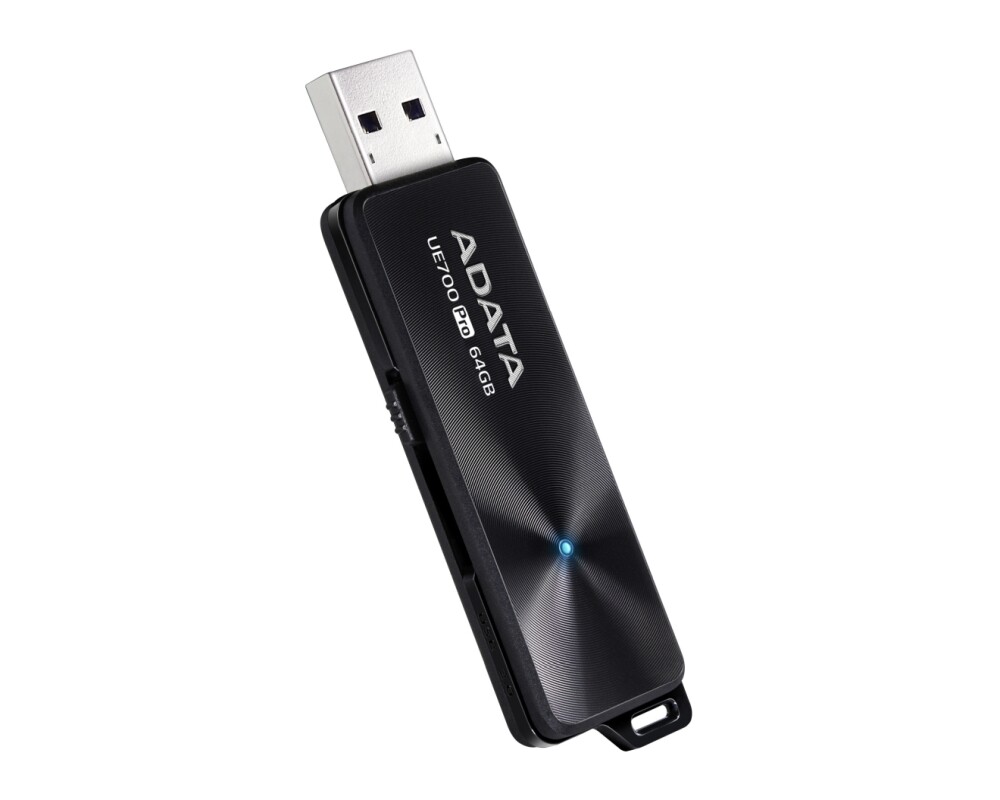 Забързайте нещата с тази ултра бърза флаш памет от Adata. UE700PRO има ултра тънък 7 мм дизайн и полирана алуминиева повърхност, която подчертава елегантните концентрични линии, които се излъчват от красивия син LED индикатор. USB конекторът й е скрит в компактното й тяло и е напълно защитен без да е необходимо да използвате капачка. Единственото, което трябва да направите е да плъзнете бутона й и тя ще бъде готова за употреба. Същото движение, но в обратна посока ще прибера конектора по време на пътуване или пренасяне. Ако пожелаете може да свържете UE700PRO към гейминг конзоли и да я използвате като резервно място за съхранение на игри, които не играете в момента.