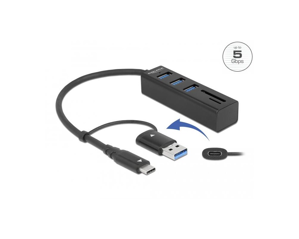 USB хъб от Delock с метален корпус, може да бъде свързан към компютър, лаптоп или мобилно устройство чрез