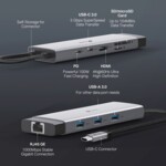 - 9-в-1 USB-C хъб: UH9120C превръща един USB-C порт в 9 порта с 4K@60Hz HDMI, 1 Gbps Ethernet, SD и microSD UHS-I, 100W захранване, 1× USB-C порт за данни, 3× USB-A порта за данни.