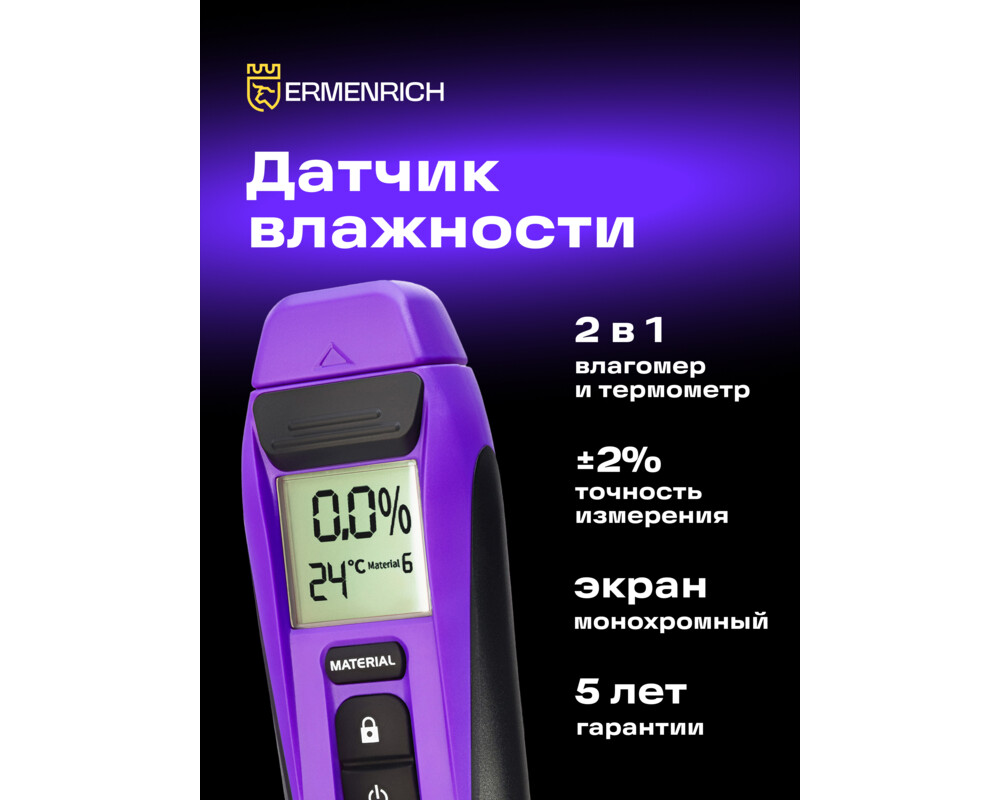<p>Ermenrich MW20 е преносим влагомер или детектор за влага. Той може да измерва бързо влажността на различни материали: дърво, картон, бамбук, тухли, мазилка, замазка или хоросан. Той е незаменим инструмент в строителството, дърводелството, мебелното производство и дървообработването, също така е полезен и в ежедневието, например при свързани с реновирането дейности.</p>