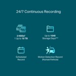 - Непрекъснато записване 24/7: Съхранява до 20 TB кадри (1048 дни за съхранение) от свързани камери, за да защити вашите данни за бърз и удобен достъп.
